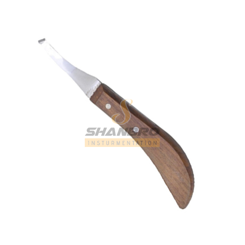 Shanbro curved hoof knife Made of high-quality special carbon steel. Short CURVED blade, polished, with sharp cutting edge geometry for prolonged performance. The ergonomic rosewood handle in combination with the shape of the blade ensures the best dynamic effect. Most carefully finished